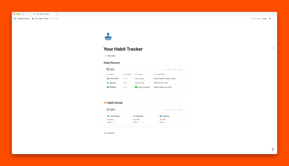 Take control of your day with an intuitive Notion-based Habit Tracker. Track, visualize, and celebrate daily progress across multiple habits. Get instant feedback with streaks, completion percentages, and clear stats.